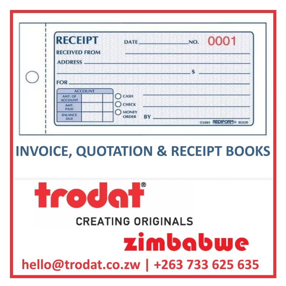 Trodat manufactures branded self-carbonated sales invoice books, quotation books, sales receipt Books, delivery note books, order books in Harare and Bulawayo, Zimbabwe. We personalize sales books with your company information including: company name, address and phone numbers. The books are made up of 50 writable pages, each page can have up to 10 individual forms sequentially numbered.